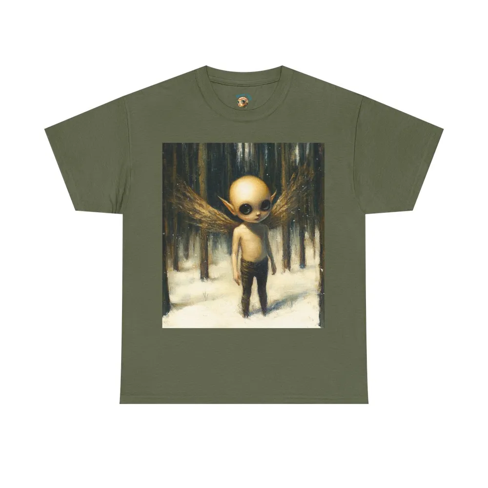 A quiet, slightly uncanny shirt that feels like a page from a dark fairytale. Soft, mid-weight cotton carries a muted illustration of a wide-eyed, winged child standing in a snowy, silent wood. The image draws you in — melancholy, curious, and a little wild — and the classic crewneck silhouette makes this tee easy to wear layered under a jacket or alone when you want the art to speak. Wear it when you crave something poetic and strange; it settles into the wardrobe as a thoughtful, conversation-starting piece.