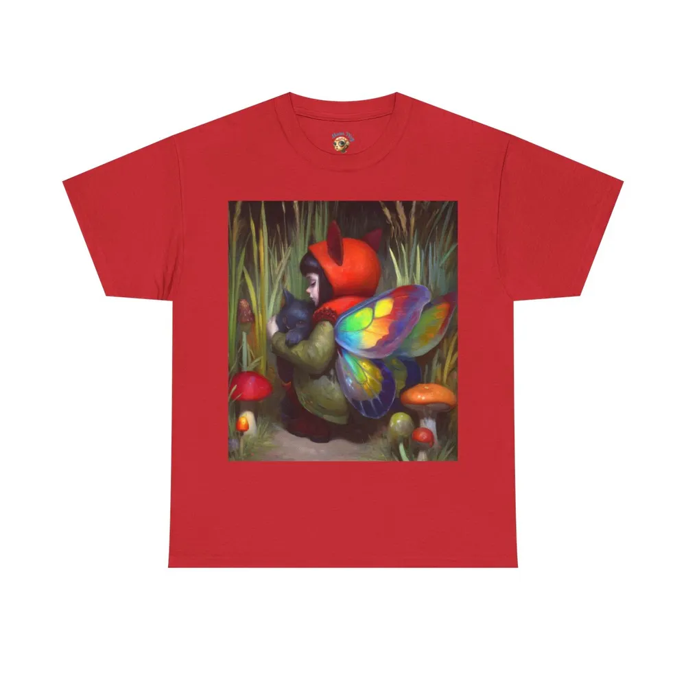 This soft, classic-fit tee carries a tiny world on the chest — a quiet, whimsical scene of a hooded child with vibrant, rainbow butterfly wings crouched among mushrooms and tall grass. It feels like a secret kept between dusk and dawn: gentle, thoughtful, slightly mysterious. Wear it when you want your outfit to whisper a story rather than shout. The medium-weight cotton holds fine print detail beautifully, while the tear-away label and ribbed collar keep the shirt comfortable all day. This shirt sits naturally in casual wardrobes for people who love nature, fantasy, and understated art — a wearable sketchbook for slow, curious days.